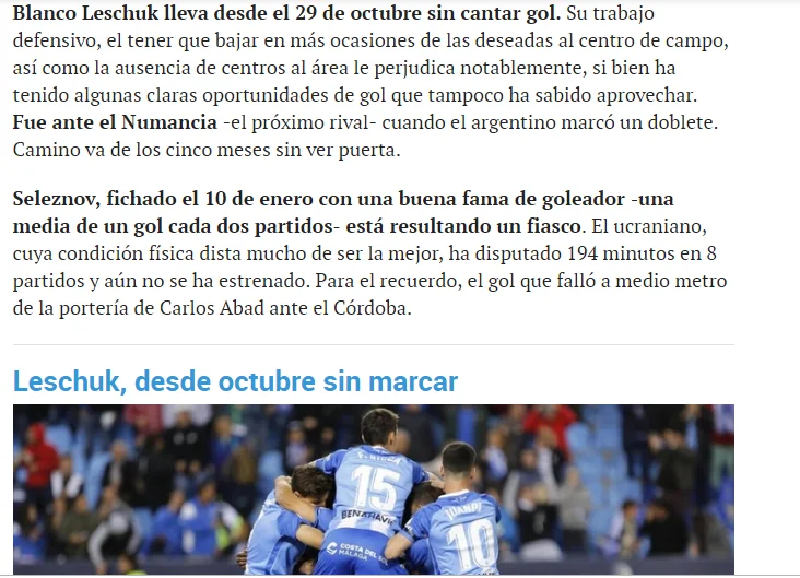 AS вважає, що кризу результатів Малаги ілюструють страждання її форвардів. "Бланко Лещук без голів вже чотири з половиною місяці, Харпер – майже два місяці, Коне вибув ще 17-го листопада, а те, що бачили дотепер від Селезньова, було дуже скупим. Усього в цьому сезоні форварди Муньїса забили менше половини командних голів (12 з 29-и): відзначались лише Бланко Лещук (6), Харпер (4) і Коне (2).