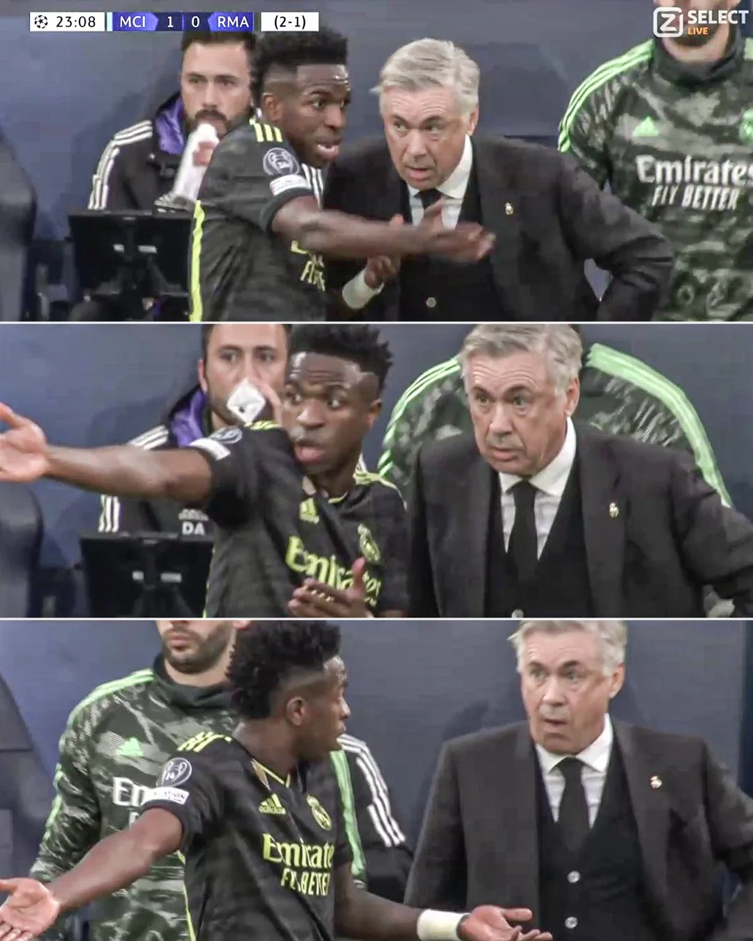 Винятком не став Вінісіус, який зазвичай демонструє усім свої емоції. Зокрема, після першого гола бразильський вінгер накинувся на Карло Анчелотті.