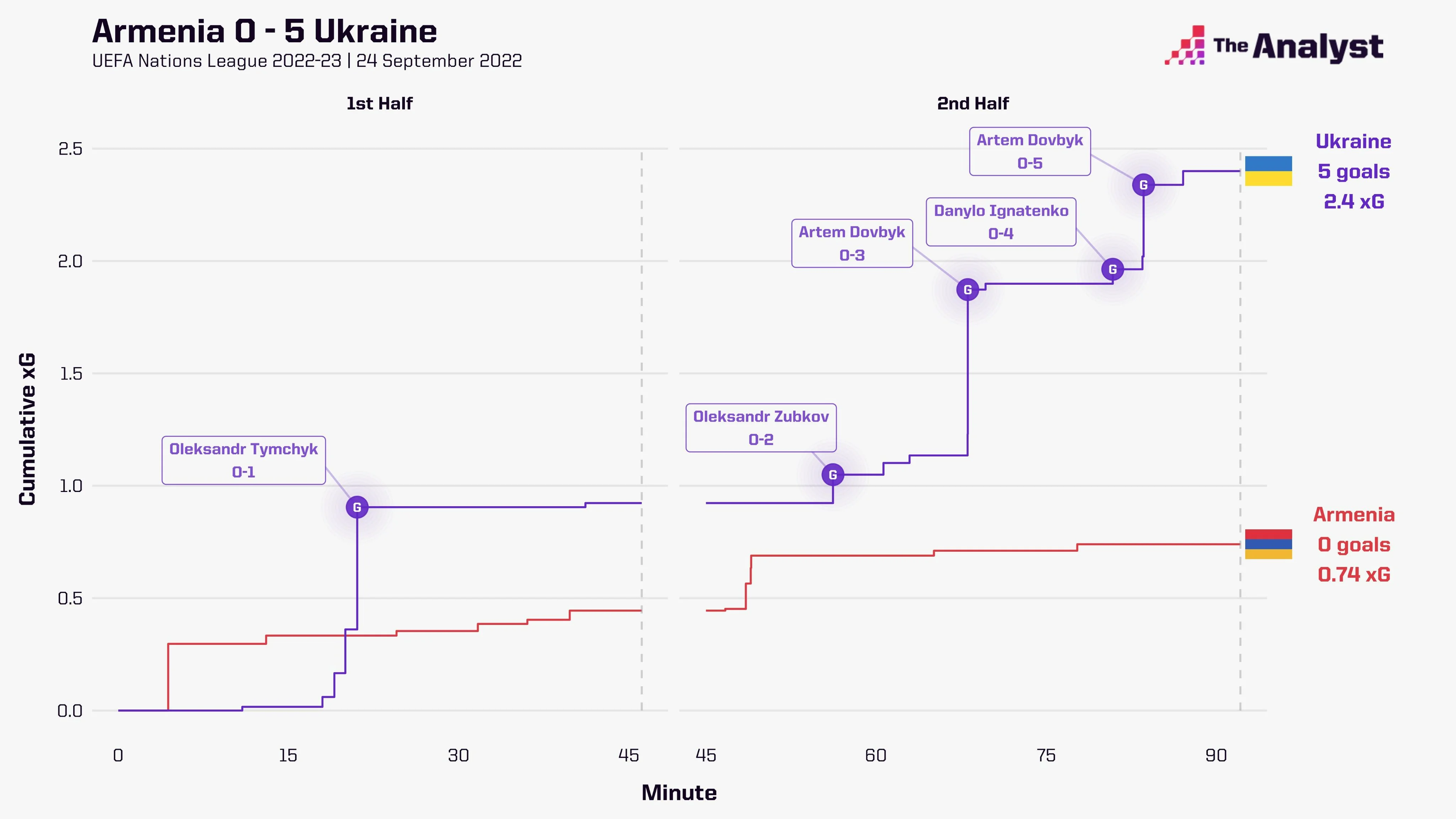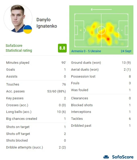 Обом крайнім захисникам збірної України надають допомогу. Вірмени пробивають здалеку, Лунін оформлює 4 сейв. Знову добре працює перший пас Забарного. Ярмоленко і Довбик розігрують, проходить пас назад на зовсім вільного Ігнатенка, який з 3 дальньої спроби забив свій дебютний гол у першому матчі в основі збірної. Артем ще й дубль встиг оформити. Дніпрянин після кількох верхових дуелей опустив м'яч вниз, накрутив захисників і переграв голкіпера. У Довбика 6 голів і асист за 11 офіційних матчів у збірній, 47 хвилин на результативну дію! Україна вперше в історії тричі поспіль обігрує Вірменію. Команда Петракова до вечірнього матчу Ірландії проти Шотландії повернулася на перше місце, випереджаючи останню на 1 бал. Усе в будь-якому разі вирішить дуель проти "тартанової армії" у вівторок, 27 вересня, о 21:45.