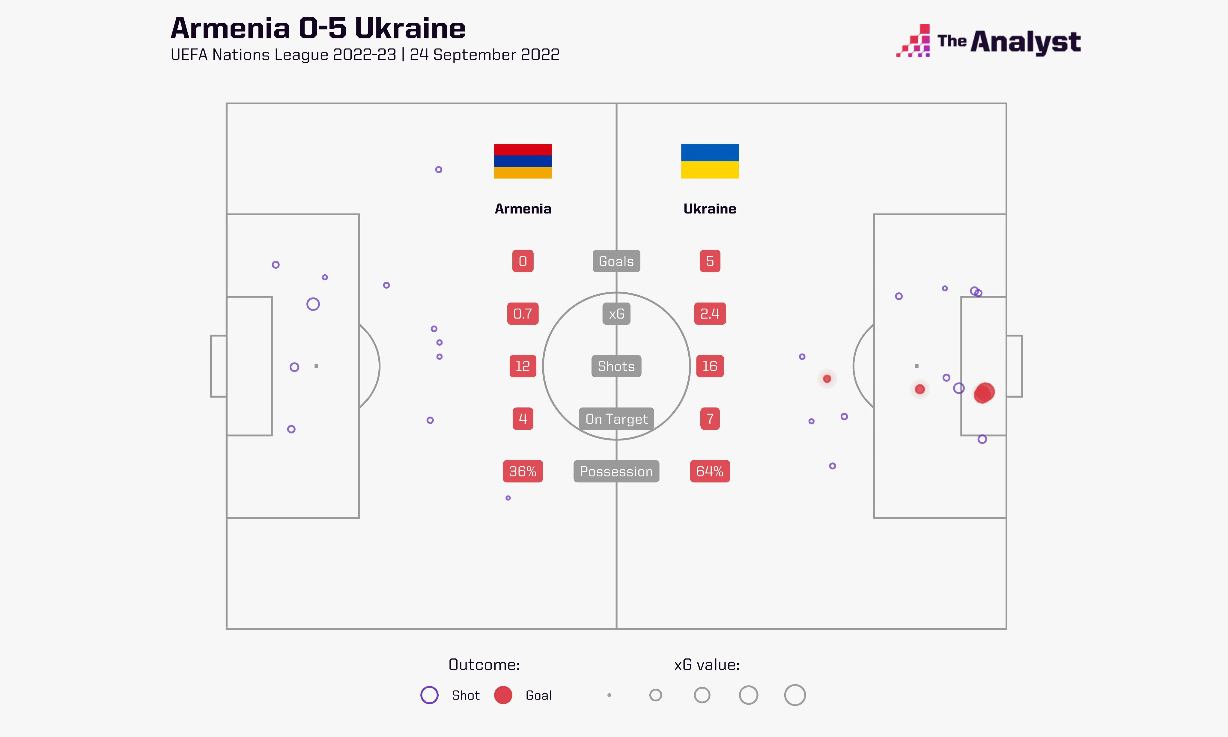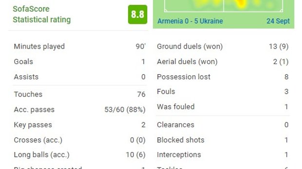 Історична аномалія. Перша розгромна перемога на полі збірної Вірменії. Нарешті зуміли перервати ці серії, коли після двох звитяг наставали осічки. З більшим рахунком в офіційних матчах Україна перемагала лише 4 рази (Андорру та Сан-Марино). Були ще 6:0 проти Азербайджана, але в товариській грі. Андрій Ярмоленко повторив досягнення Андрія Шевченка (111 зіграних матчів за Україну). Більше тільки в Тимощука (144). Тепер ще 3 голи треба забити, аби зрівнятися з рекордною кількістю забитих м'ячів легендарного Шеви в національній команді (48). За якихось 24 хвилини Ярмола встиг стати найкращим за кількістю створених моментів (3, на все про все 13 точних пасів з 14 загалом).