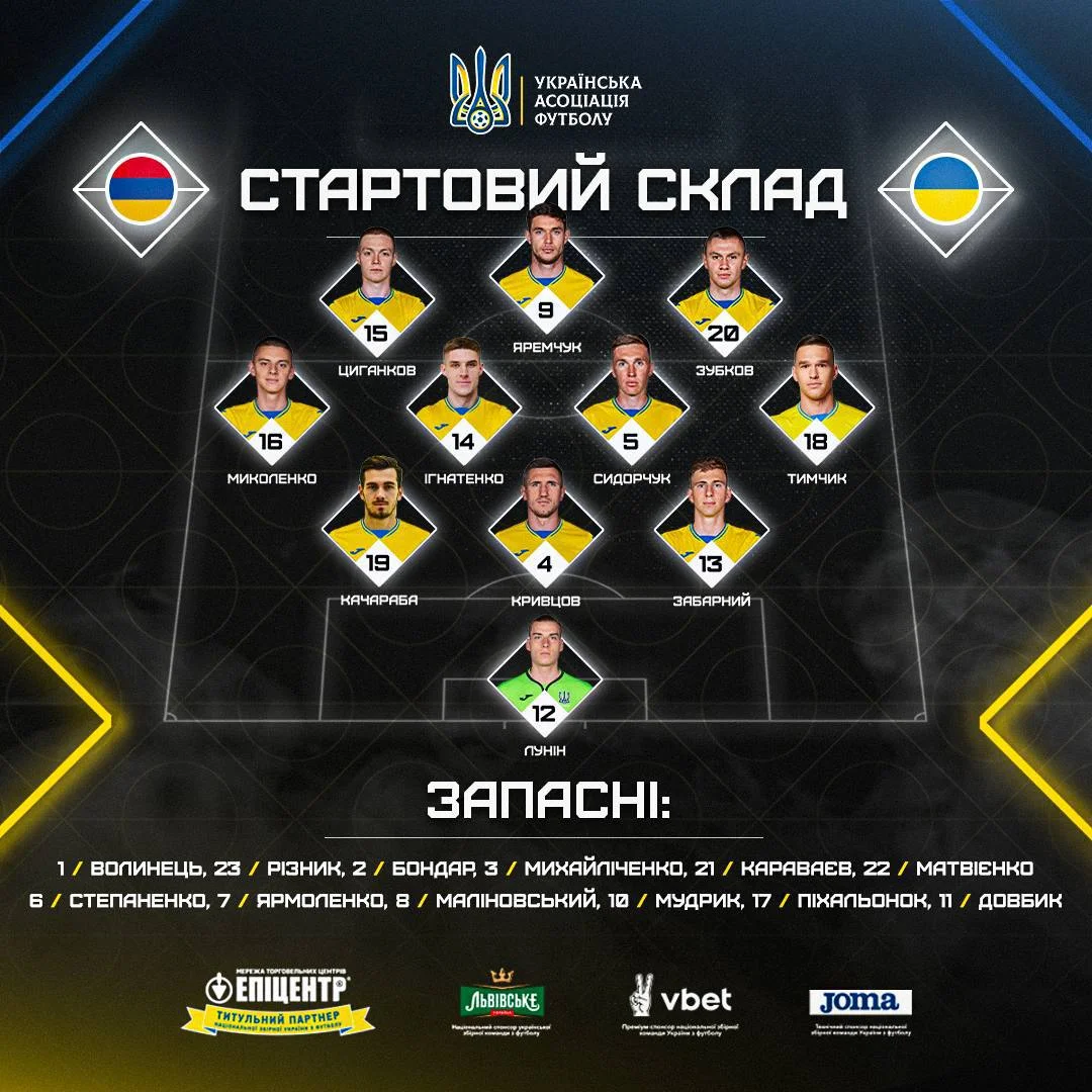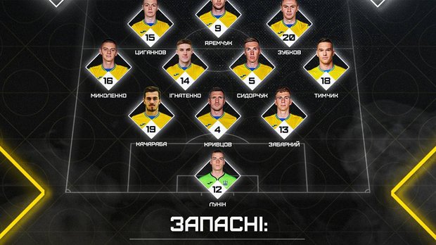 Стартовий склад збірної України: 12. Андрій Лунін – 13. Ілля Забарний, 4. Сергій Кривцов, 19. Тарас Качараба – 18. Олександр Тимчик, 14. Данило Ігнатенко, 5. Сергій Сидорчук (к), 16. Віталій Миколенко – 20. Олександр Зубков, 9. Роман Яремчук, 15. Віктор Циганков