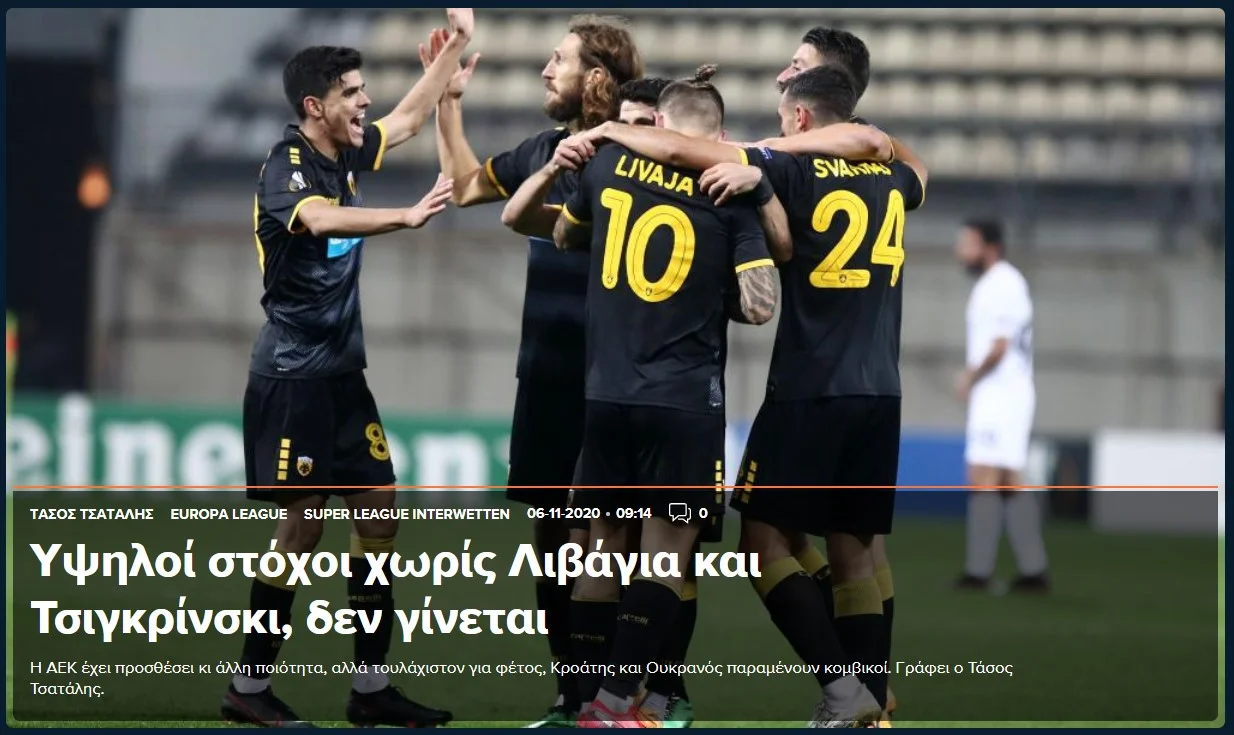 Зоря насправді не така слабка, як могло здатися вчора. Це заслуга АЕКа, який не дозволив українцям зіграти з фірмовим високим пресингом. Наші форварди з перших хвилин поставили Зорю в некомфортні умови", – аналізує журналіст Тасос Цаталіс.