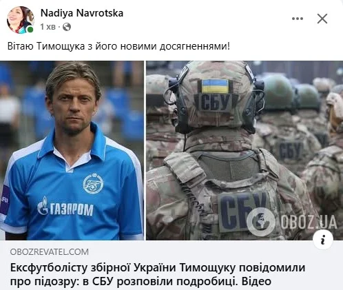 На резонансну новину відреагувала колишня дружина Тимощука Надія Навроцька. "Вітаю Тимощука з його новими досягненнями", – написала вона на своїй сторінці у соціальній мережі Facebook.
