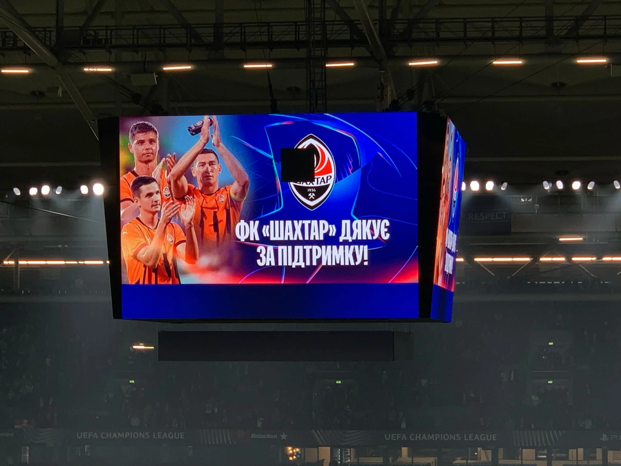 Атмосфера на стадіоні захоплювала: вкрай заповнені трибуни, крики, співи, емоції, радість, гнів. У ці моменти я почувалася найщасливішою людиною на світі. Очі горіли від щастя, а тілом пробігали мурашки. Особливим моментом було звучання гімну Ліги чемпіонів вживу. А перед цим на головному екрані демонстрували відео, де лідери Шахтаря Тарас Степаненко та Георгій Судаков дякують німецькому народу за підтримку.