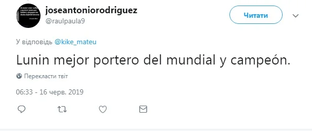 Іспанська Marca виділила чотирьох гравців збірної України U-20, які внесли вагомий вклад у перемогу "синьо-жовтих" на чемпіонаті світу-2019. Андрій Лунін, окрім визнання преси, отримав ще й порцію компліментів від іспанських вболівальників.