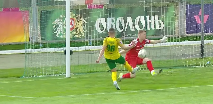 І все ж Лівий Берег зумів розкрити суперника перед перервою. Супершанс отримав Синиця, який відкрився на дальній стійці за спинами захисників. Когут віддав діагональ в ноги Олегу, а той опинився в кількох метрах від голкіпера – втім, подальший удар Марченко парирував. Якби він пропустив, Оболонь опустилась би в зону перехідних матчів.