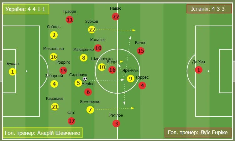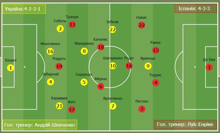 У рідких випадках, коли нам вдавалося заволодіти територією, іспанці переходили на формацію 4-1-4-1. Заміни у другому таймі були по позиціях і кардинально не змінили малюнок гри. Лише вихід Циганкова виявився ключовим. Як і у матчі з Францією, Віктор забив гол з-за меж штрафного. Склалося враження, що гольова комбінація не спонтанна. На мій погляд – це награна ситуація.
