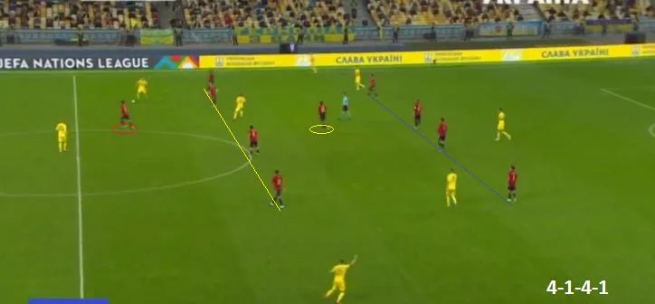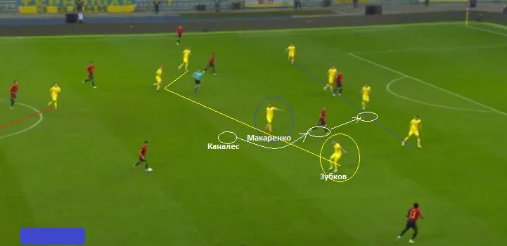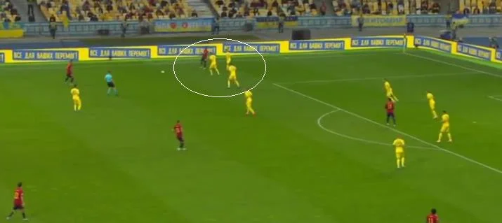 У випадках, коли іспанські хавбеки зміщувалися у інші зони, наприклад підключалися у лінію атаки, Макаренко та Сидорчук передавали їх партнерам і залишалися грати по зоні. На скріншоті вище – восьмий номер збірної України (у синьому колі) сигналізує захисникам про передачу опонента. Поряд Зубков також жестом підказує фулбеку, що зараз суперник змістить акцент на правий фланг своєї атаки. Взагалі, дисципліна та комунікація у наших хлопців були на досить високому рівні.