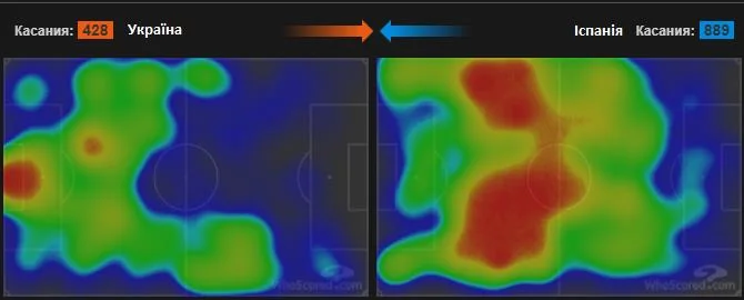 Дивно, чому раніше тренерам нашої команди не приходила думка, що з подібними суперниками не потрібно сперечатися за м'яч. Фактично, уся наша безнадія у Мадриді була у нашому намаганні контролювати м'яч. На фоні таких команд просто не можемо виходити з-під їхнього пресингу. Це інший рівень, космос. Більша частина моментів біля воріт Пятова тоді виникала після систематично невдалих спроб розпочати позиційну атаку короткими розіграшами від своїх воріт. Команда Шевченка добре діє згідно зі своїми принципами з суперниками нижчого та ідентичного рівня. З топ-збірними ми елементарно не спроможні розбивати організований пресинг. Тут нам ще є над чим працювати. Зверніть увагу на теплову мапу матчу Україна – Іспанія. У гостей була величезна територіальна перевага, але не можна сказати, що вони перегравали господарів поля.