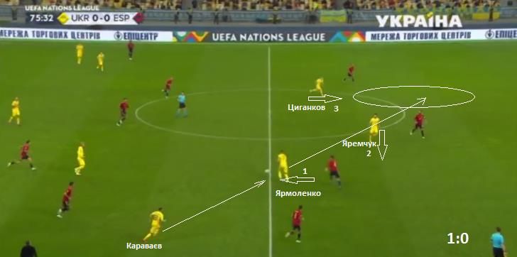 Розпочав атаку Бущан. Він вкотре довів свій рівень гри ногами. Караваєв у центрі поля у вільній зоні без спротиву скинув м'яч на Ярмоленка, який опустився глибше. Одночасно Яремчук грамотно повів за собою центрального захисника у напівпростір, відкривши зону для Циганкова.