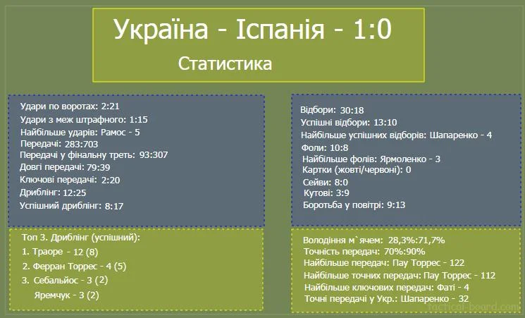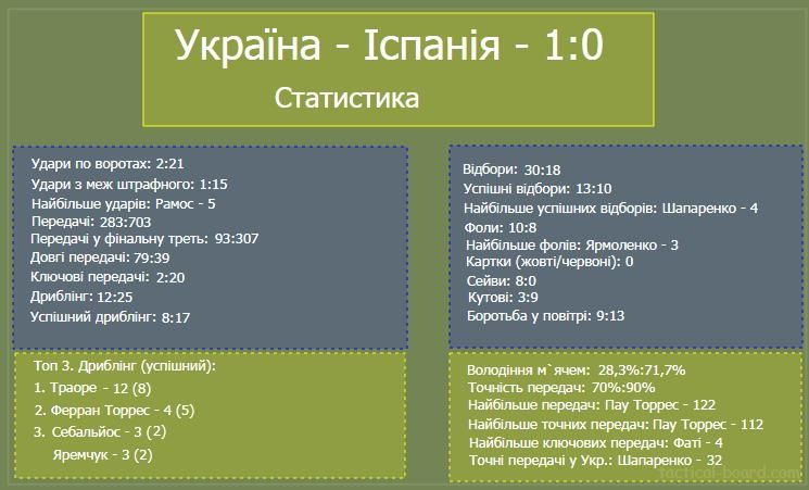 Взагалі, якщо дивитись на статистику, то може скластися хибне враження, що Іспанія тотально перегравала суперника і повністю контролювала ситуацію на полі.