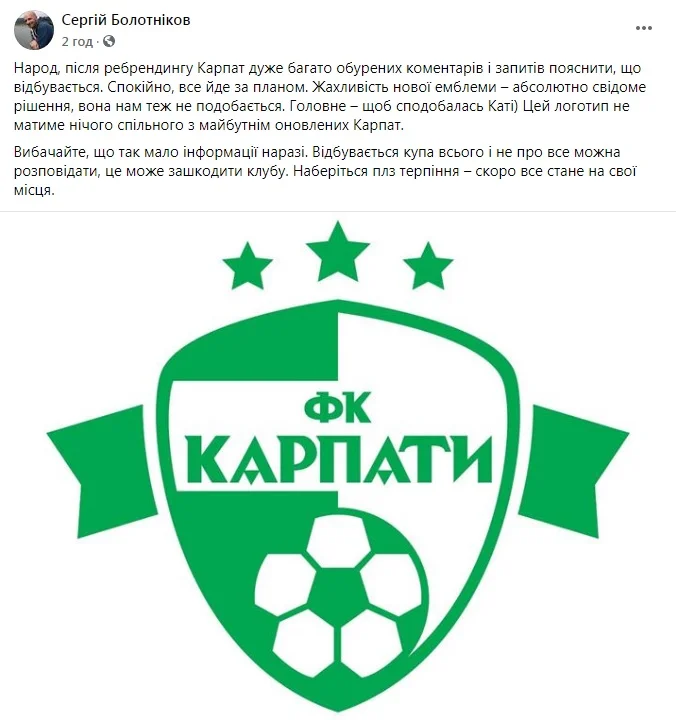 "Після ребрендингу Карпат дуже багато обурених коментарів і запитів пояснити, що відбувається. Спокійно, все йде за планом. Жахливість нової емблеми – абсолютно свідоме рішення, вона нам теж не подобається. Цей логотип не матиме нічого спільного з майбутнім оновлених Карпат.