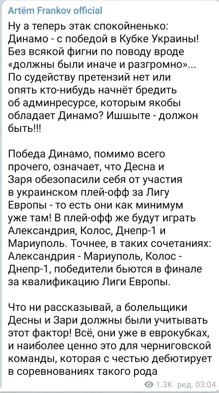 Головний редактор журналу Футбол Артем Франков розповідає про двох інших тріумфаторів Кубка України: "Перемога Динамо, крім усього іншого, означає, що Десна і Зоря убезпечили себе від участі в українському плей-офф за Лігу Європи – тобто вони як мінімум вже там! У плей-офф ж гратимуть Олександрія, Колос, Дніпро-1 і Маріуполь. Точніше, в таких поєднаннях: Олександрія – Маріуполь, Колос – Дніпро-1, переможці б'ються в фіналі за кваліфікацію Ліги Європи".