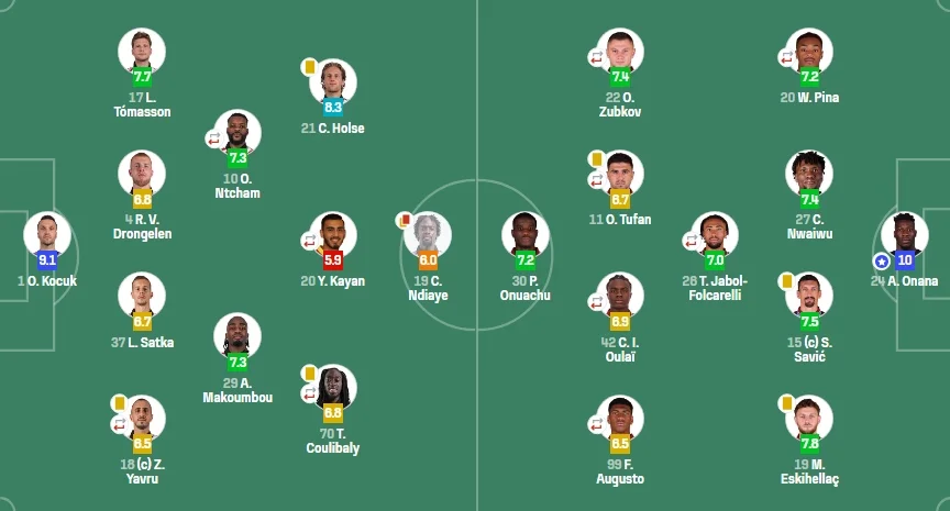 Арсеній Батагов пропускав цю гру через травму коліна, а Олександр Зубков відіграв 72 хвилини, поступившись місцем Ернесту Мучі. Портал SofaScore оцінив українського вінгера рейтингом 7,4. А ось Онана отримав максимальні 10 балів.