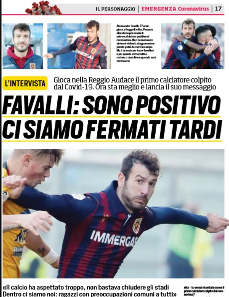 Напередодні 27-річному футболістові зателефонував автор BBC Даніеле Веррі, а також представники сайту Джанлуки Ді Марціо. У розмовах зі ЗМІ Фаваллі-молодший підтверджує, що футбольна влада діяла надто необачно. Він також описує симптоми та гнітючу атмосферу, яка супроводжує життя хворих і їхніх сімей. Тільки взимку 2020-го він перебрався в Реджану – команду, яка доволі успішно боролася за вихід у Серію Б до всіх цих жахів. Завдяки трансферу він зміг повернутися на Північ Італії, щоб стати ближчим до своєї родини – надважливої цінності для кожного італійця особливо у такий важкий час. Його країна найбільше в Європі потерпає від пандемії – десятки тисяч заражених, сотні трупів кожного дня, які нікуди дівати.