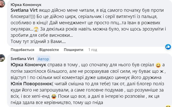 В коментарях почалися обговорення з фанатами, де Вірт ділилася деякими подробицями. Вочевидь, вона давно була невдоволена присутністю Поворознюка, який з жовтня 2020 року знімав серіал про команду. В кадр часом потрапляли скандальні ситуації, які зазвичай не хочеться показувати назагал.