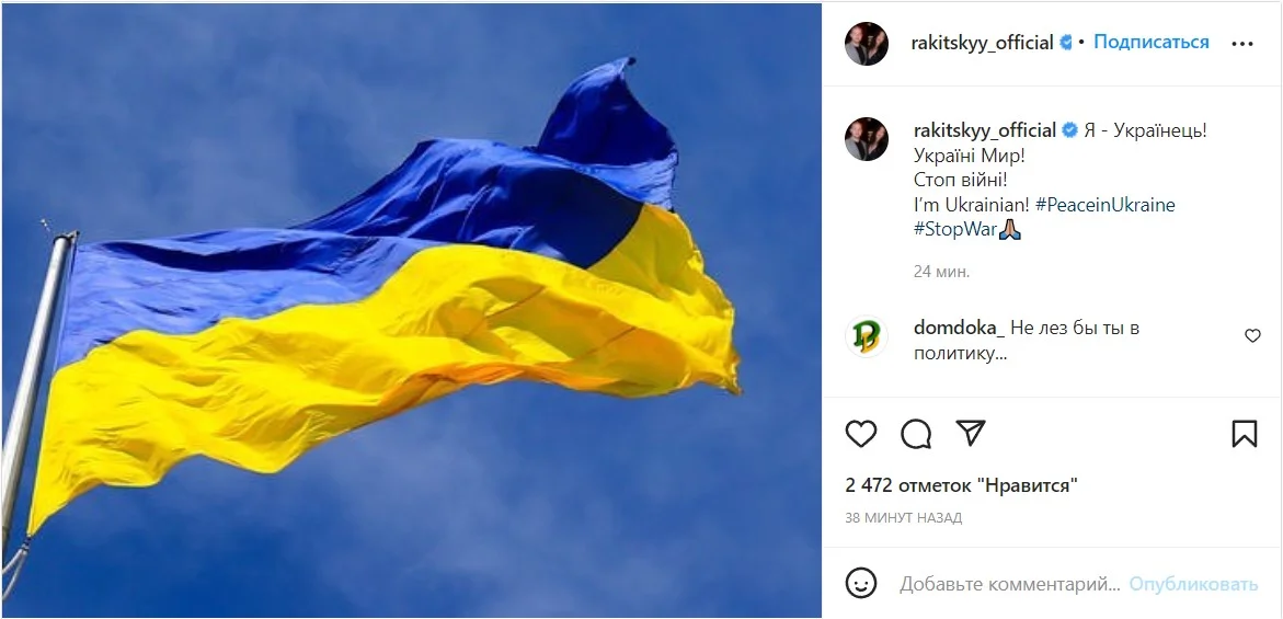 "Я – Українець! Україні Мир! Стоп війні!" – написав Ракицький в Instagram під світлиною з українським стягом.