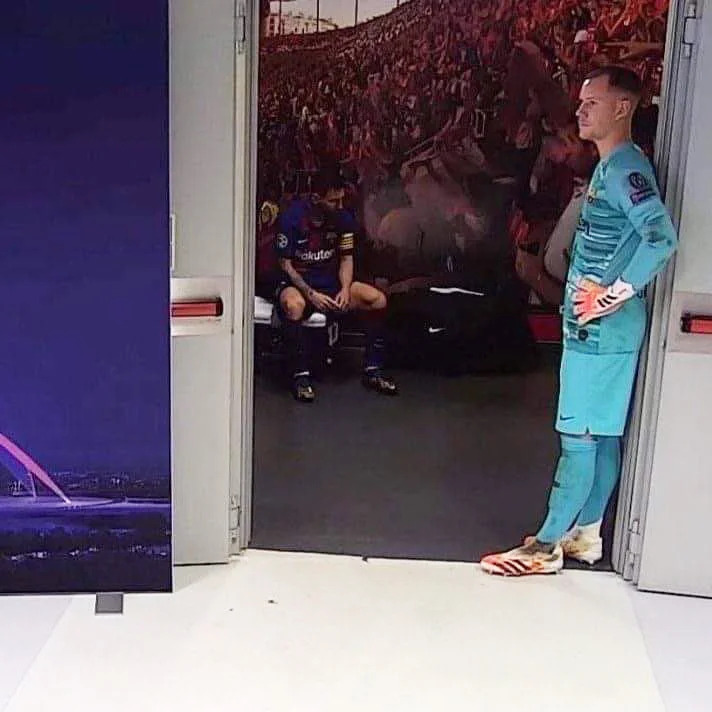 На світлині зображений форвард каталонців Ліонель Мессі та голкіпер команди Марк-Андре тер Штеген. Нагадаємо, на перерву команди пішли за рахунку 4:1 на користь мюнхенського клубу.