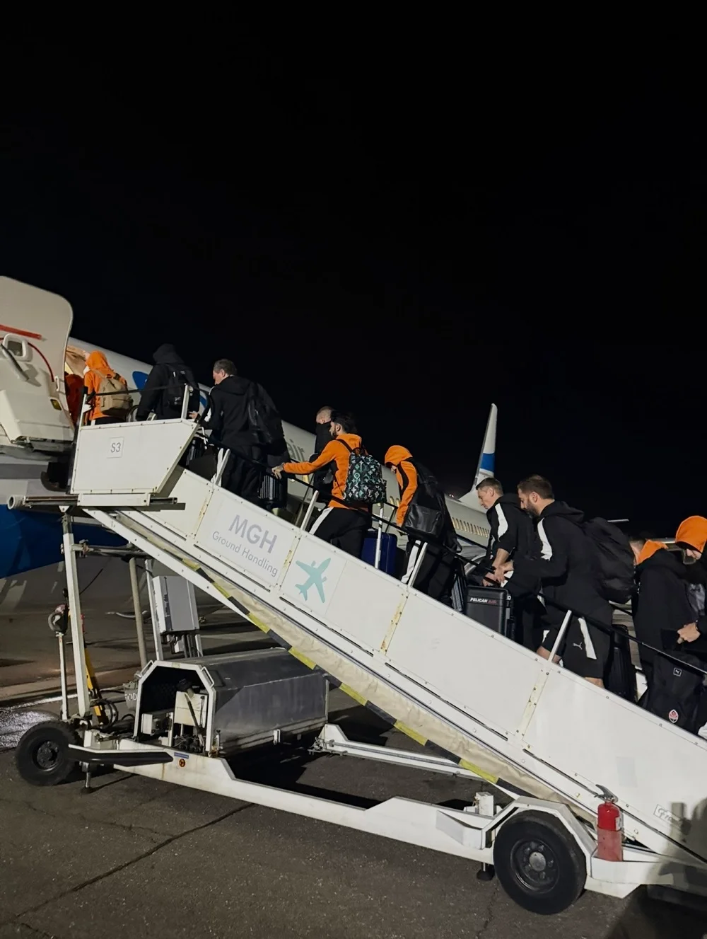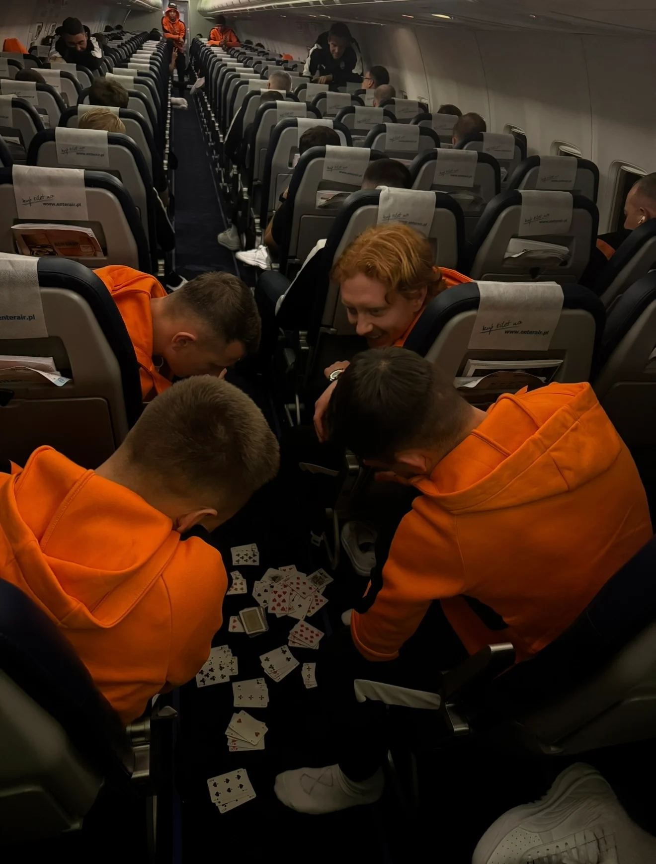 Близько 19:30 почалося завантаження на літак. Ми вирушали разом із гравцями – хтось одразу поринув у телефон, хтось обирав фільм, дехто заснув ще до зльоту. А одна четвірка традиційно влаштувала турнір у карти: Конопля, Різник, Назарина та Криськів грали без перерви майже весь політ.