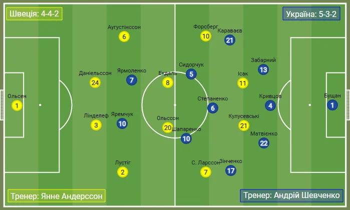 Тактична схема та стартовий склад скандинавів були досить передбачуваними. Команда Янне Андерссона, як завжди, будувала свою гру за структурою 4-4-2. Питання було лише по одній позиції – хто зіграє поруч з Ісаком у нападі: досвідчений Берг чи талановитий Кулусевскі, який відбув карантин та вже набрав необхідну форму. Наставник північних "синьо-жовтих" обрав більш універсального гравця Ювентуса.