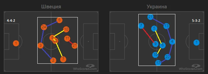 Тим не менш, нова структура збірної України саме у протистоянні зі шведами мала більше переваг ніж недоліків. Головна перевага полягала у гарантованій чисельній більшості при розіграші м'яча у своїй третині поля – три центрбеки проти пари форвардів. До того ж номінальні гості діяли досить обережно. У початковій стадії позиційних атак латералі та хавбеки пропонували додаткові варіанти. Лише після просування м'яча у другу третину поля Зінченко та Караваєв підіймалися практично до лінії атаки, утворюючи ширину.