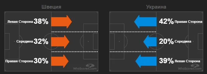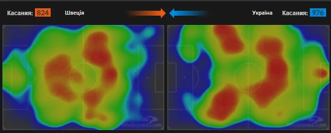 Загальна теплова мапа виглядає вражаюче, але великою мірою ці гарячи плями – наслідок додаткового часу та дещо рафінованого контролю м'яча. Показники зон активних дій підкреслюють, що обидві команди діяли достатньо збалансовано, не завалюючись на один із флангів. Хоча шведи трохи активніше взаємодіяли на своєму лівому фланзі. Відрізок гри у більшості, після цілком заслуженого вилучення Даніельссона, трохи покращив загальний показник активності України на третині поля суперника, але навіть кінцеві 22% – досить низький показник у протистоянні з приблизно рівною командою.