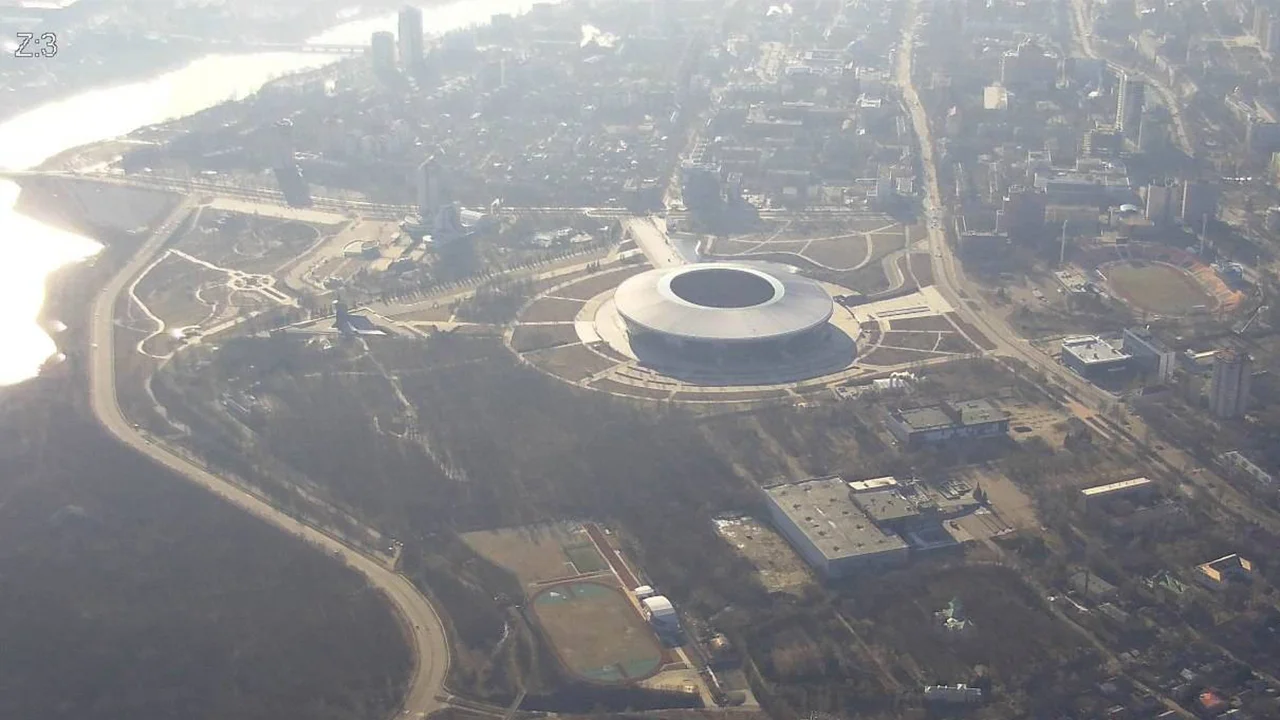 На скріншотах відео зі зйомки добре видно, що попри неодноразові обстріли, стадіон Шахтаря практично не постраждав.