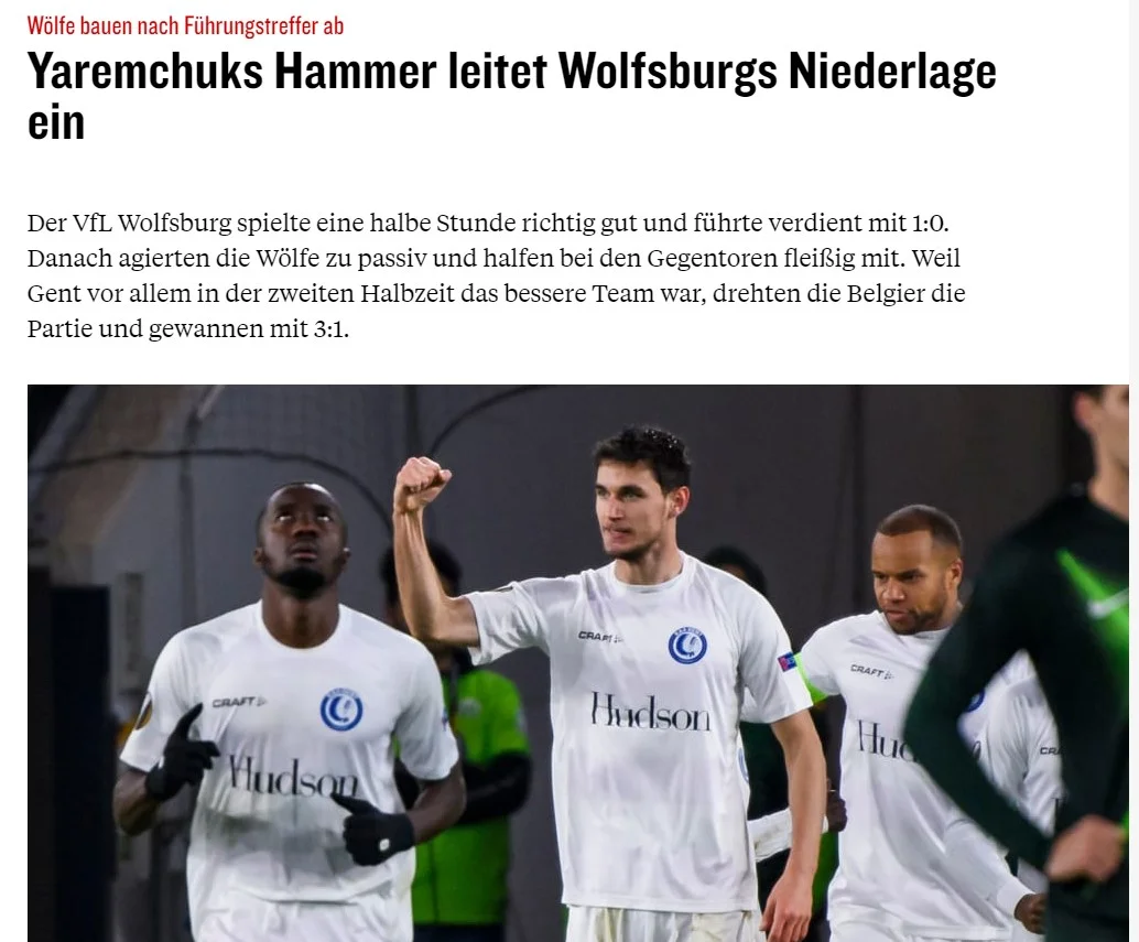 Роман Яремчук на старті другого тайму красивим голом повернув Гент у гру, адже до того часу бельгійці вже вирівняли ситуацію на полі, але якісних моментів біля воріт Первана не створювали. Романа виконав винятковий удар. Німецький Kicker вийшов із заголовком "Молот Яремчука започаткував фіаско Вольфсбурга".
