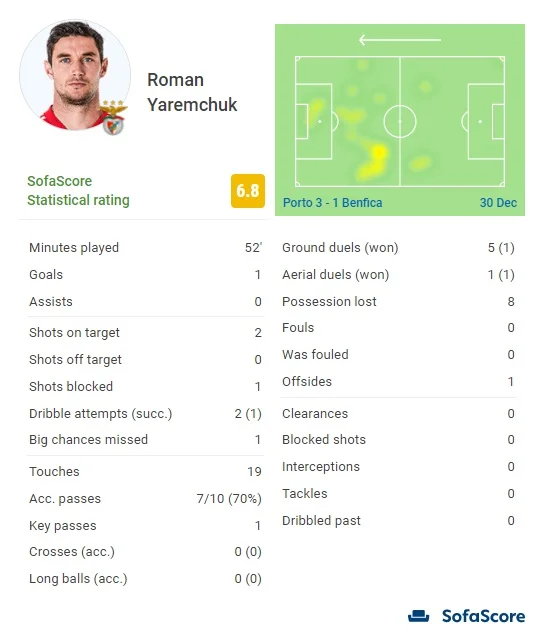 Але вже на 52-й хвилині українець пішов з поля. Капітан "орлів" Андре Алмейда отримав другу жовту картку і був вилучений. Наставник Бенфіки – Нелсон Веріссіму – змушений був вносити корективи. Жертвою тренерського рішення і вилучення партнера став саме Яремчук. Українець отримав від Sofa Score оцінку 6.8 – середній бал у команді.