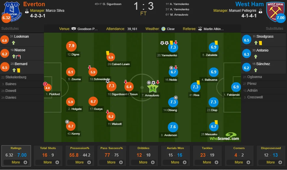 Андрій Ярмоленко двічі відзначився за свій новий клуб, ще один гол додав невтомний Арнаутовіч. Гості завдали першої поразки Евертону Марку Сілви в сезоні, хоча йому не вистачало кількох відсутніх гравців. Пеллегріні на своє 65-річчя отримав подарунок у вигляді гостроти та відданості від Вест Хема.