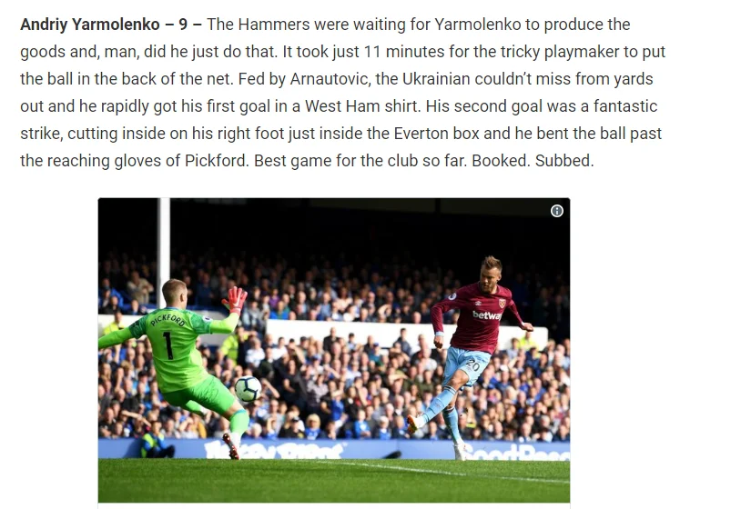 А ось на думку іншого аналітичного сайту, наш футболіст заслужив одного з найвищих можливих балів – 9. Стільки ж тільки в Арнаутовіча. "Молоти" чекали від Ярмоленка, коли він почне творити свої справи. І цьому хитрому плеймейкеру вистачило якихось 11 хвилин, щоб запакувати м'яч у сітку. Українець не мав права схибити після пасу Арнаутовіча. Другий гол Андрія – фантастичний удар, зрізання правою ногою у штрафний Евертона і викручування м'яча повз рукавички Пікфорда.
