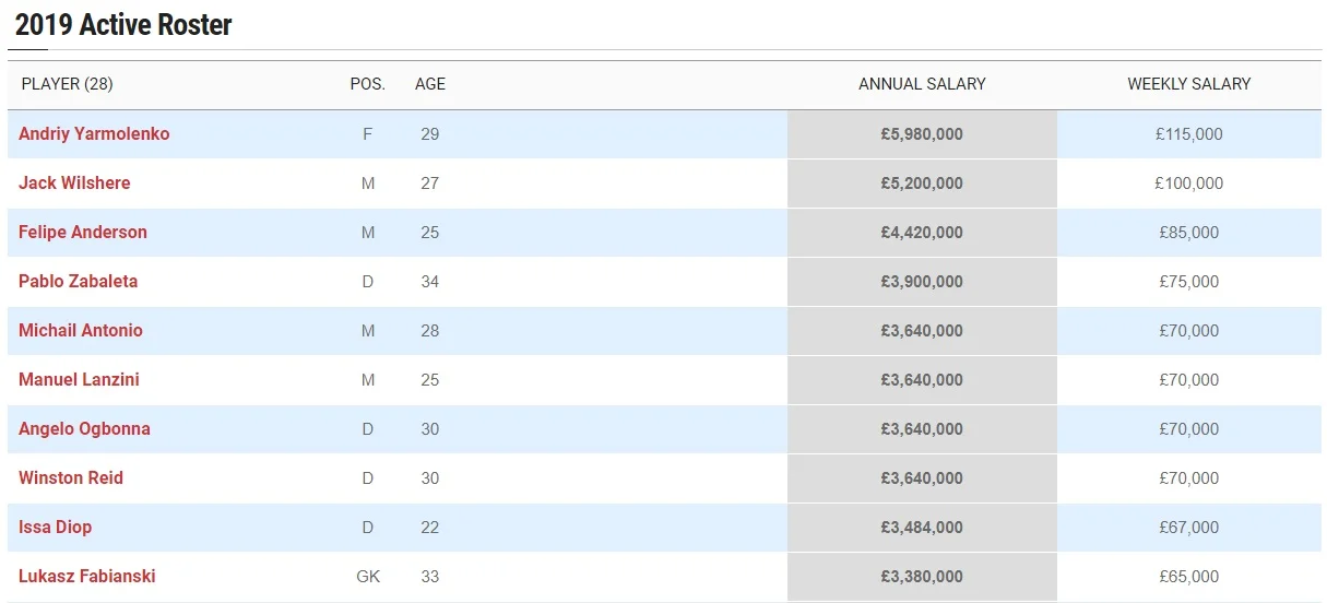 Авторитетний портал Sportmac, який спеціалізується на трансферних і зарплатних показниках, опублікував список зарплат футболістів Вест Хема в сезоні 2019/20.