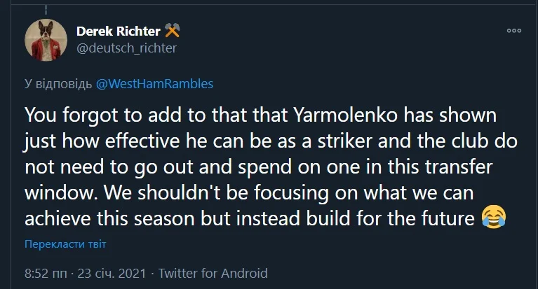 "Ви забули додати, що Ярмоленко продемонстрував, наскільки ефективним він може бути як нападник. Клубу не потрібно виходити на ринок та витрачати гроші під час цього трансферного вікна. Ми не повинні зосереджуватися на тому, чого можемо досягти у цьому сезоні, а натомість будувати на майбутнє".