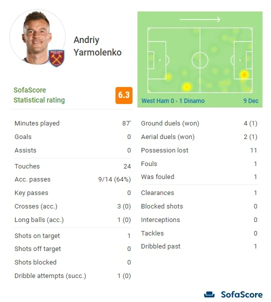 Андрій 24 рази отримував м'яч, одного разу пробив у площину воріт, а єдина спроба дриблінгу була невдалою. Не пішло і з передачами – лише 64% пасів Ярмоленка знайшли адресата. Девід Мойєс замінив 32-річного вінгера за кілька хвилин до фінального свистка, а Вест Хем, хоч і програв Динамо Загреб, але фінішував першим у груповому турнірі та вийшов до 1/8 фіналу Ліги Європи.