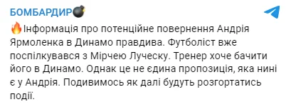 Telegram-канал "Бомбардир" підтвердив потенційний трансфер капітана збірної України в київський клуб. За інформацією джерела, 32-річний футболіст вже встиг поспілкуватися з головним тренером "біло-синіх" Мірчею Луческу. Румунський наставник запевнив Андрія, що хоче бачити його в Динамо.