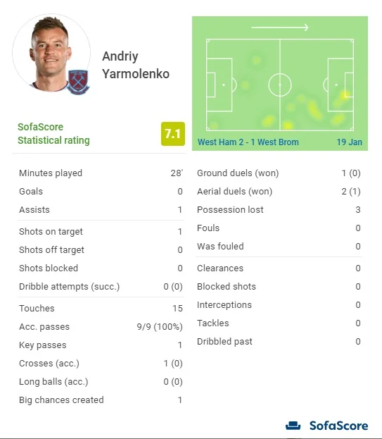Англійські ЗМІ та статистичні портали традиційно оцінили гру футболістів обох команд у вчорашньому матчі. Ярмоленко отримав середні бали у складі Вест Хема абсолютно від усіх видань. Наприклад, у Sofa Score поставили українцеві 7.1 – Андрія оцінили вище, ніж Боуена, який відзначився забитим м'ячем (6.6). Кидається в очі абсолютна точність передач від українця – всі 100% його пасів знайшли адресата. Щоправда, їх було лише 9 – не надто серйозний показник за майже півгодини гри.