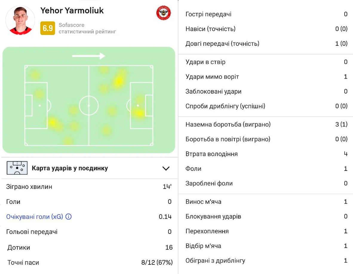 Для українців же ця зустріч була важлива через інший факт – на 76-й хвилині Єгор Ярмолюк замінив Єнсена, офіційно дебютувавши в АПЛ.