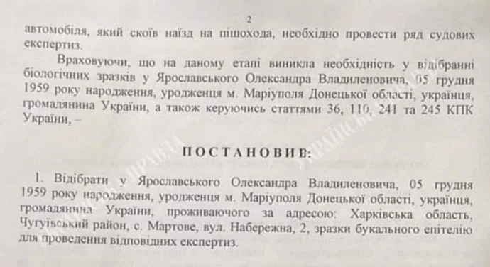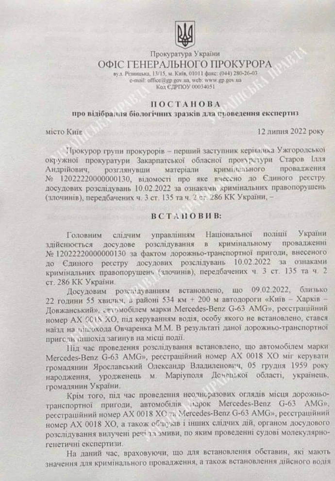 Зазначається, що у пункті пропуску "Малий Березний" на кордоні зі Словаччиною Ярославський із адвокатом поспілкувався з представником прокуратури та дав згоду на проходження ДНК-експертизи. Це має посприяти визначити, хто перебував за кермом авто кортежу Ярославського на початку лютого 2022 року, внаслідок чого загинула людина. Після перетину кордону бізнесмен має приїхати в Офіс Генерального Прокурора на допит як свідок.