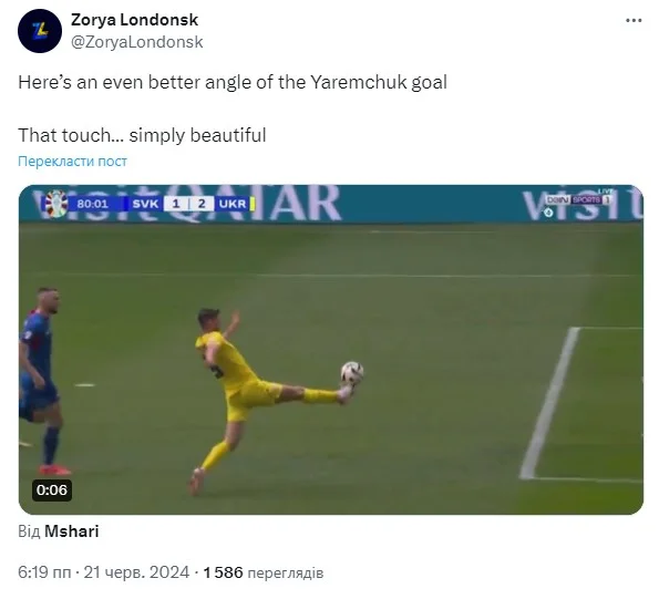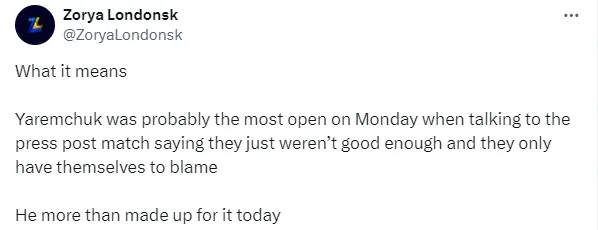 Ендрю Тодос (Zorya Londonsk) насолоджується магічним дотиком, яким Яремчук приборкав м’яч перед тим, як відправити його у ворота. "Яремчук був, мабуть, найбільш відвертим у понеділок, коли спілкувався з пресою після матчу, сказавши, що вони повинні звинувачувати лише себе. Сьогодні він із надлишком компенсував це".