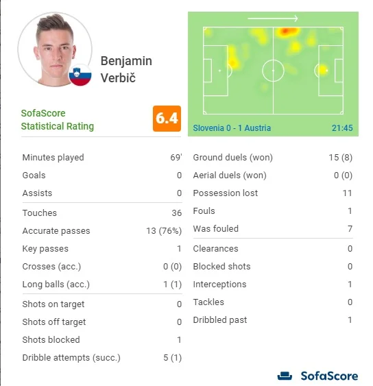 В групі G Словенія з Беньяміном Вербічем мінімально програла Австрії. Динамівець відіграв 68 хвилин та отримав від Sofa Score скромні 6,4 – найнижчий бал в команді та другий найгірший в матчі.