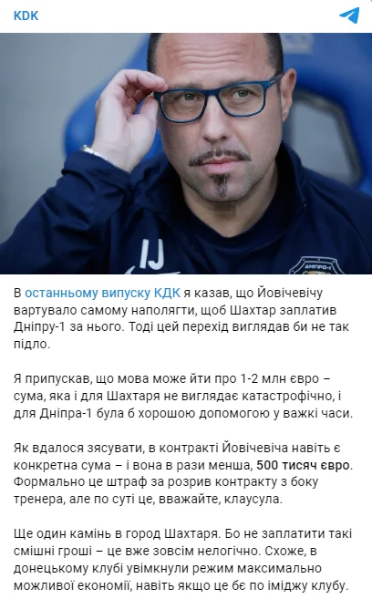 Хорватський фахівець Ігор Йовічевіч має виплатити штраф СК Дніпро-1 за передчасний відхід з команди, повідомляє Telegram-канал KDK.