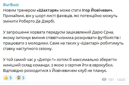 За його словами, директору Шахтаря імпонує вміння Йовічевіча розкривати футболістів і працювати з молодими гравцями. Саме на свою молодь "гірники" робитимуть ставку в наступному сезоні.