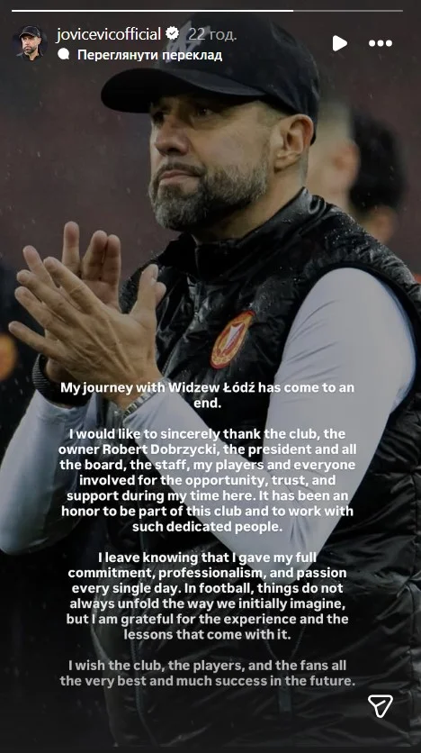 "Моя подорож із Відзевом добігла кінця. Я хотів би щиро подякувати клубу, власнику Роберту Добжицькому, президенту та раді директорів, персоналу, моїм гравцям і всім причетним за можливість, довіру та підтримку протягом мого перебування тут. Для мене було честю бути частиною цього клубу та працювати з такими відданими людьми.