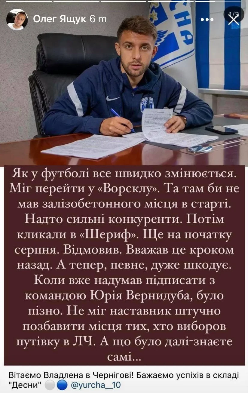 Потім кликали в Шериф. Ще на початку серпня. Відмовив. Вважав це кроком назад. А тепер, певне, дуже шкодує. Коли вже надумав підписати з командою Юрія Вернидуба, було пізно. Не міг наставник штучно позбавити місця тих, хто виборов путівку в ЛЧ", – написав Ящук в Instagram.