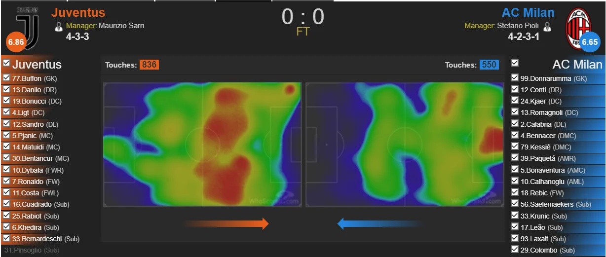 Мілан взагалі не переходив центр поля, влаштувавши Сталінград біля власних воріт. Команда дуже низько сідала й повністю віддала ініціативу ще до вилучення Ребіча – Юве мав 75% володіння м'ячем, а теплова карта виглядала ось так: