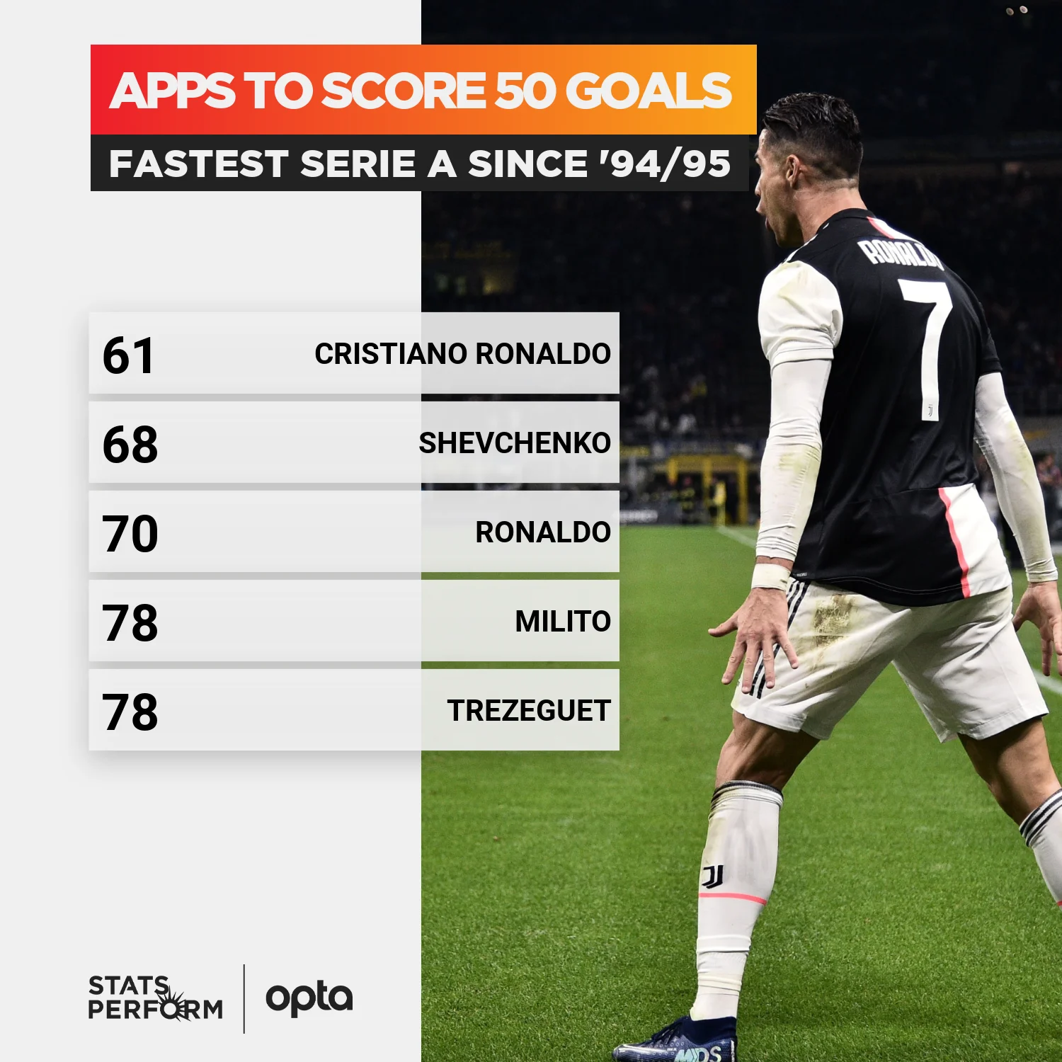Також Роналду побив рекорд нашого Андрія Шевченка, швидше за інших забивши 50 голів у Серії А – нинішній тренер збірної України поклав їх за 68 матчів, а португальцю вистачило 61-го. Це найкращий результат, починаючи із сезону 1994/95.