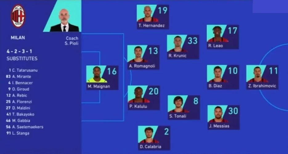 Мілан: Меньян – Калабрія (Флоренці, 76), Калулу, Романьйолі, Ернандес – Круніч, Тоналі – Мессіас (Салемакерс, 61), Діас (Беннасер, 61), Леау (Ребіч, 76) – Ібрагімовіч (Жиру, 28).