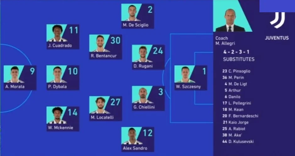 Ювентус: Щенсни – Алекс Сандро, К'єлліні, Ругані, Де Шільйо – Маккенні, Локателлі (Артур, 65), Бентанкур (Рабйо, 90), Куадрадо (Бернардескі, 65) – Мората (Кін, 74), Дибала (Кулусевскі, 90).
