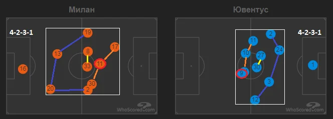 І Мілан, і Ювентус грали за базовими схемами 4-2-3-1, які у позиційній обороні трансформувалися в структуру 4-4-2. Умовні "десятки" Діас та Дибала з форвардом складали першу лінію оборони, а флангові півзахисники сідали в одну лінію з центральними хавбеками.