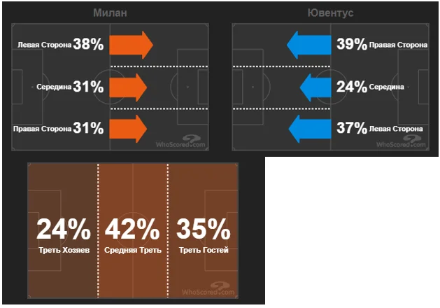 Господарі поля більше атакували своїм лівим флангом, де високо підіймався Ернандес. Калабрія часто залишався ближче до центральних захисників. Також Мілан активно намагався атакувати через центральну зону: 31% – це досить великий показник для цього вертикального коридору.